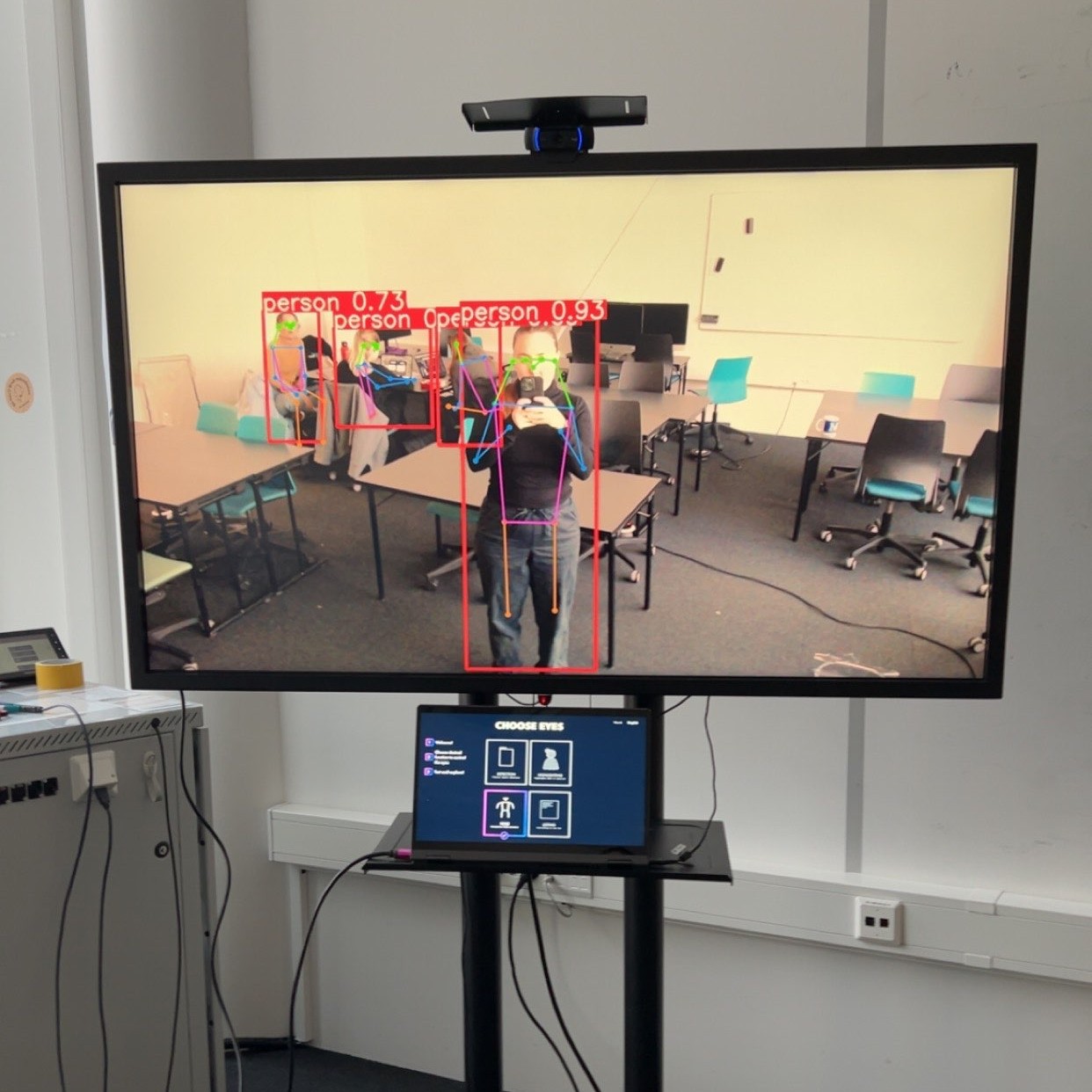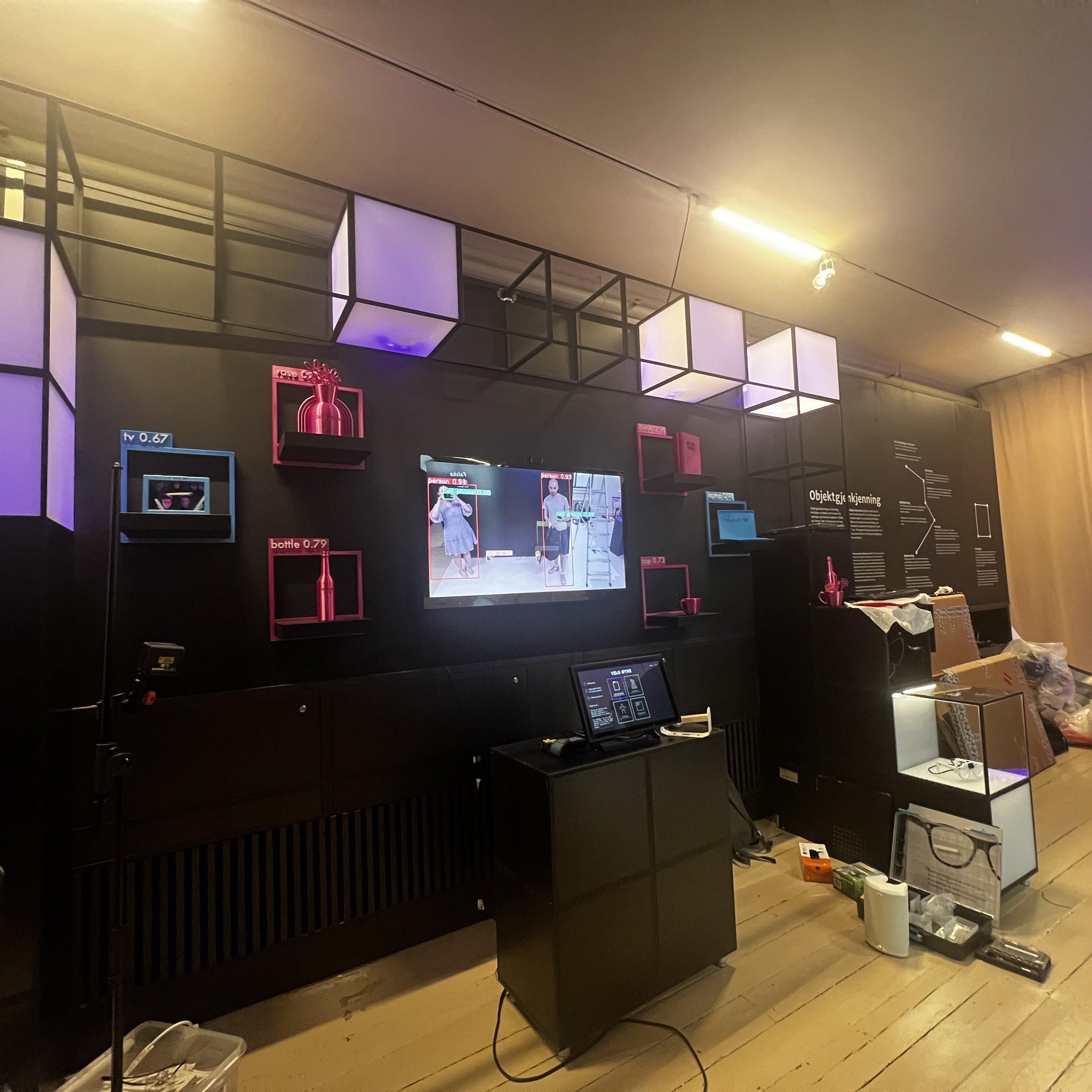 Hovedelementet i installasjonen ble da en touchskjerm med en GUI til å velge mellom de 4 modusene og få mer informasjon om hvordan de virker, og en 65 tommer skjerm som viser "Eyes of AI", altså live inference fra webcam med overlays og challenges som skal engasjere brukeren til å utforske hva som er mulig og finne evt. begrensninger med objektgjennkjenning.