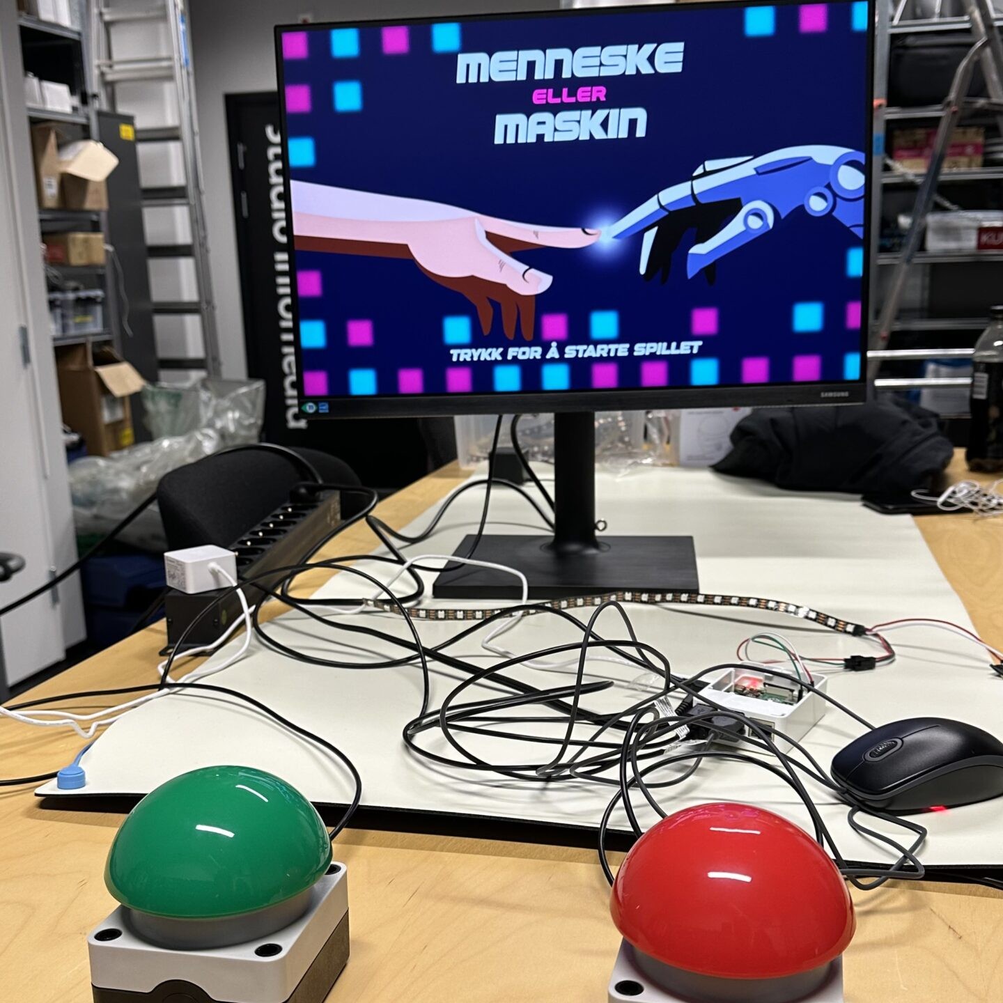 Jeg kom med Raspberry PI'en og ekstra SD-kort med endelige disc-image backups til PIen. Det var litt tricky å montere lyslenken og skjule strømforskyning og ledninger bak skjermen, men dette fikk jeg også hjelp av museumsansatte til.